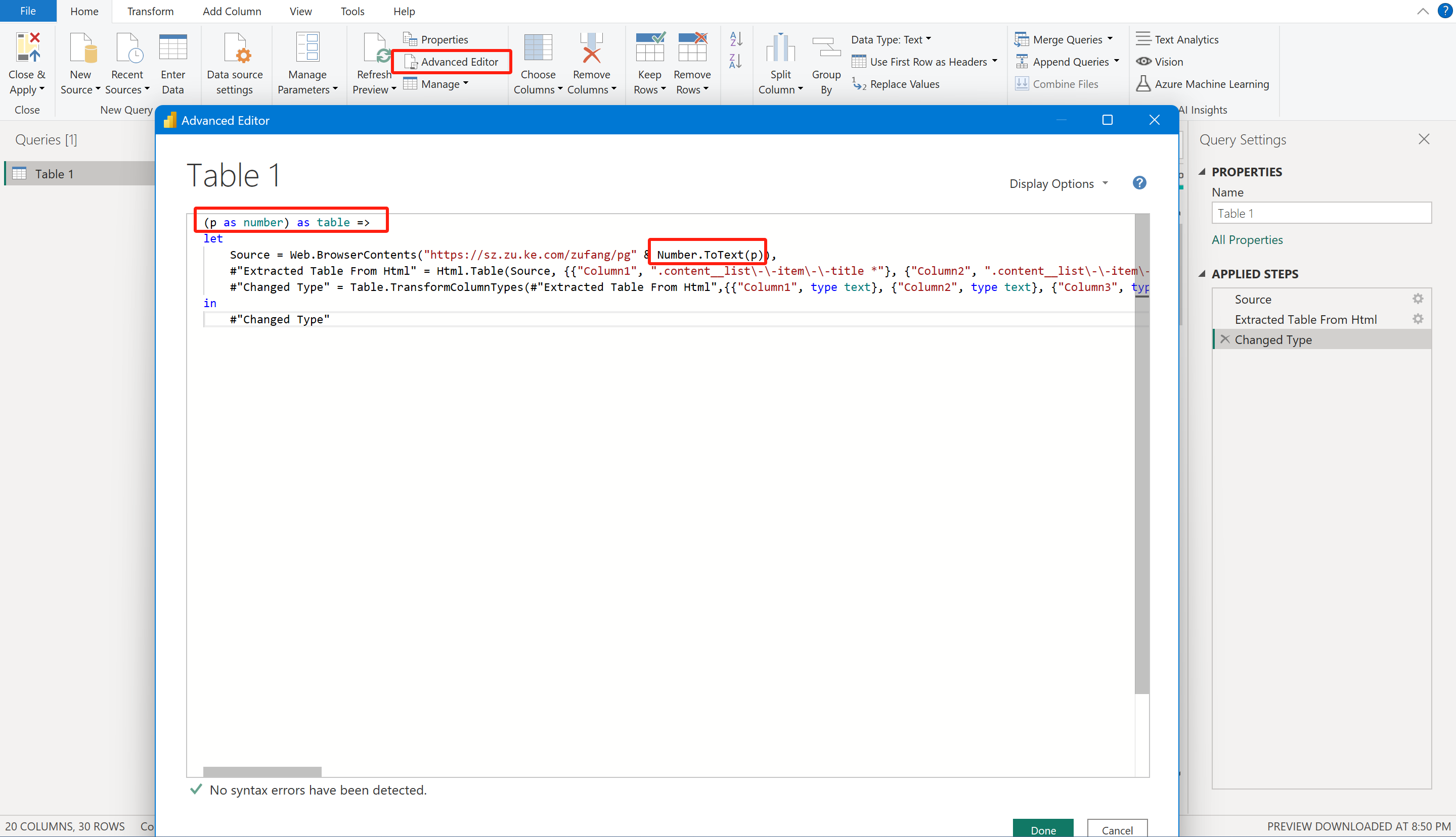 ``Number.ToText(p)`: 将定义的变量P转为文本与前面的url地址进行拼接,最终生成我们要采集数据的URL