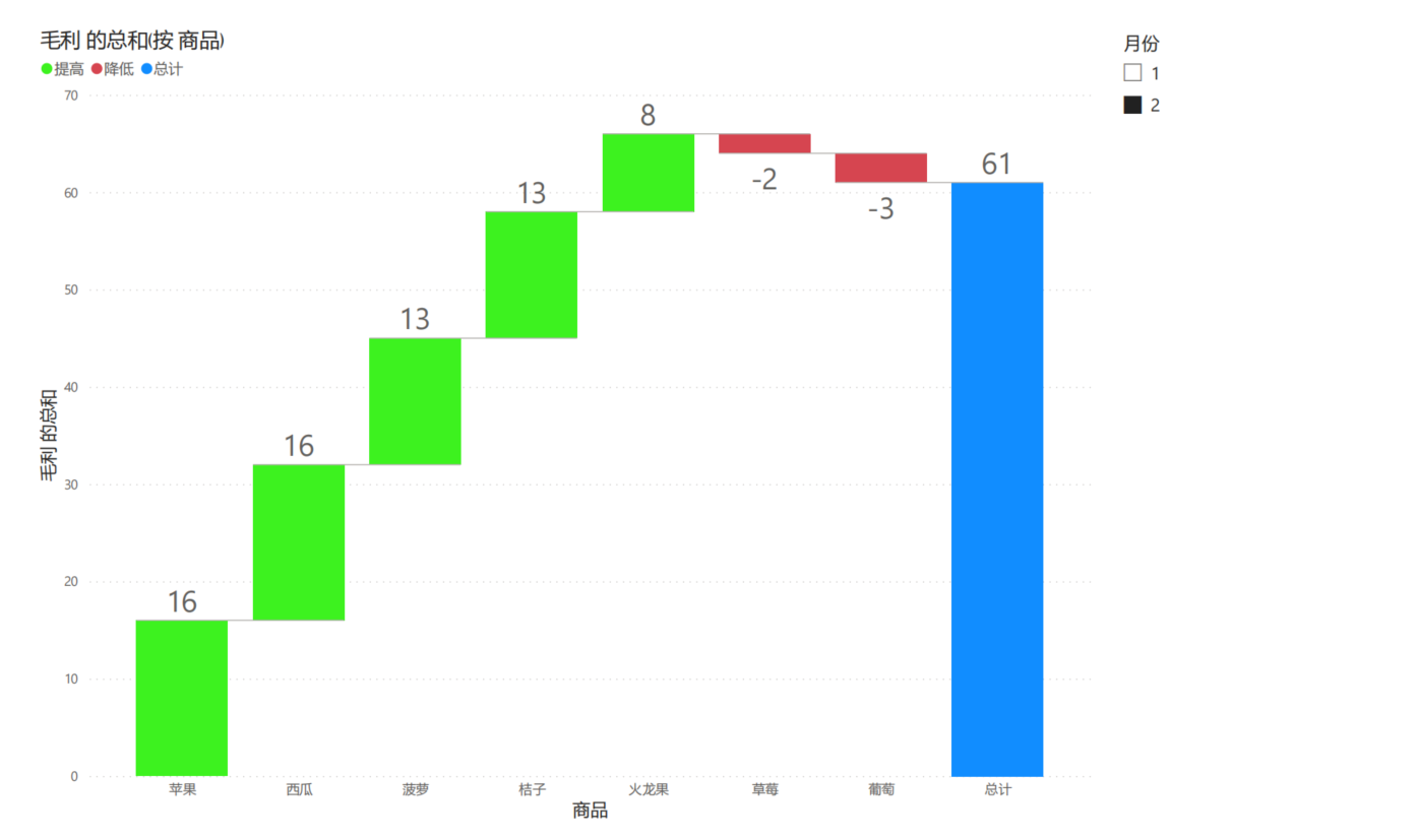 概念:瀑布图是数据可视化分析中常见的一种图形,采用绝对值与相对值结合的方式,适用于表达数个特定数值之间的数量变化关系。对于一系列具有累计性质的正值/负值具有很好的展示功能,既可以辅助理解数据的大小,又能直观地展示出数据的增减变化,反映数据在不同时期或受不同因素的影响结果