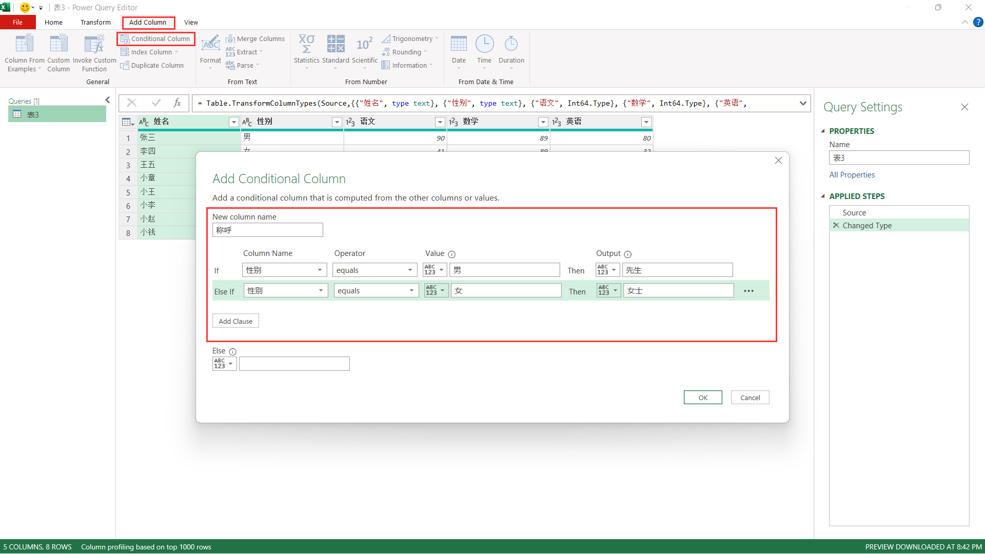 条件列允许基于现有列中的值来创建新列。例如,根据销售量对数据进行分类。这可以通过 “添加列” 选项卡下的 “条件列” 完成。