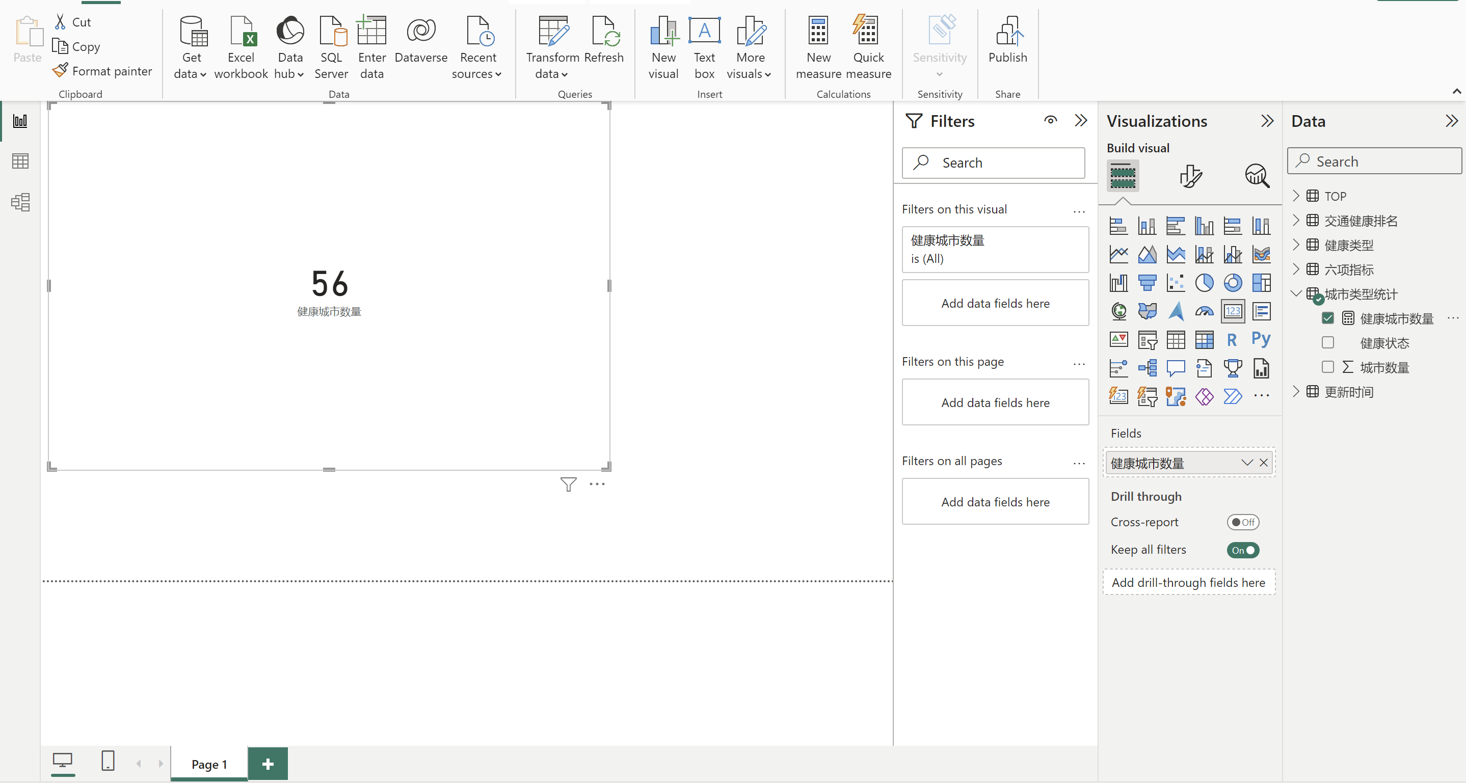 健康城市数量 =CALCULATE(MAX('城市类型统计'[城市数量]),'城市类型统计'[健康状态]="健康"),在城市类型统计表里面健康类型这个字段等于健康的,统计满足条件的城市数量最大值。