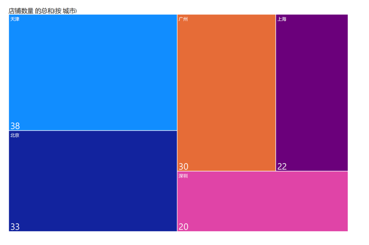 概念:树状图将分层数据显示为一组嵌套矩形。 层次结构中的每个级别都由一个有色矩形(分支)表示,其中包含更小的矩形(叶)。 Power BI 根据度量值来确定每个矩形内的空间大小。 矩形按大小从左上方(最大)到右下方(最小)排列。