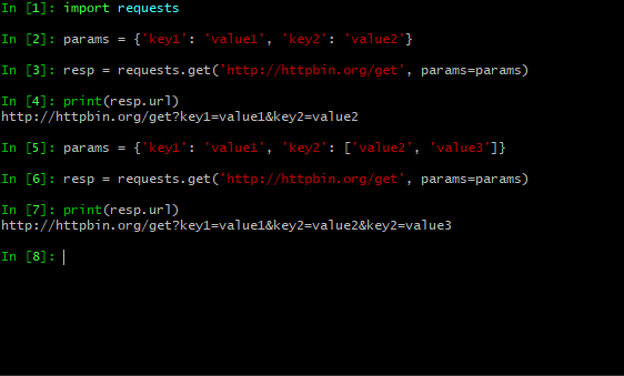 传递URL参数也不用再像urllib中那样需要去拼接URL,而是简单的,构造一个字典,并在请求时将其传递给params参数,此时,查看请求的URL,则可以看到URL已经构造正确了,并且,有时候我们会遇到相同的url参数名,但有不同的值,而python的字典又不支持键的重名,那么我们可以把键的值用列表表示: