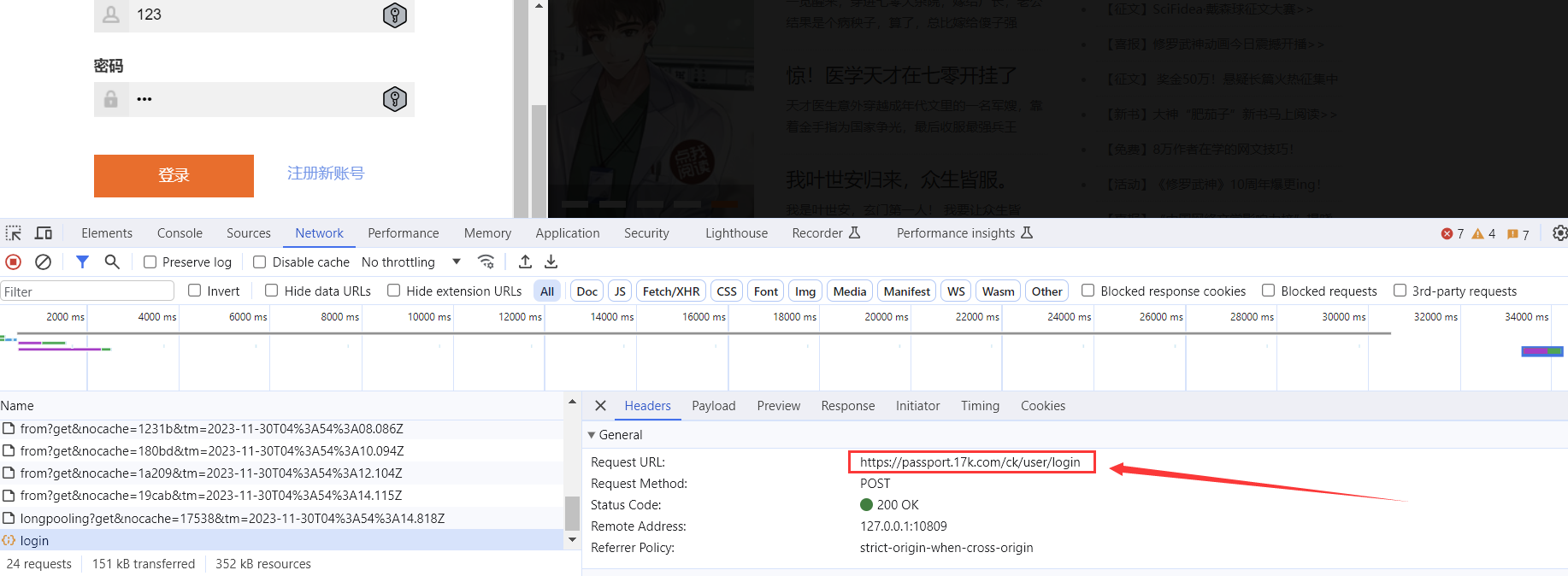 尝试登录操作,发现操作后会其Headers下会显示请求的网址https://passport.17k.com/ck/user/login,且请求类型为POST
