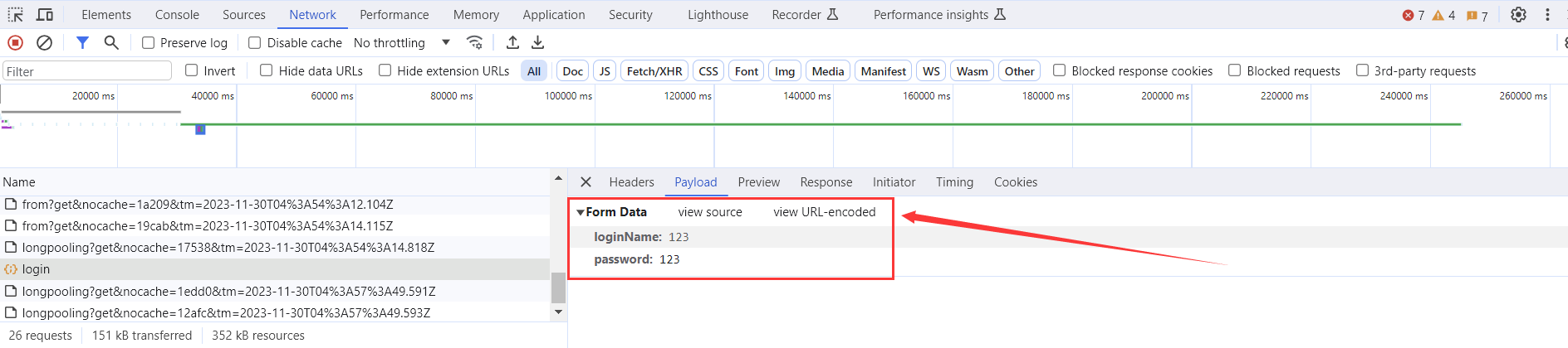 在Payload下可以发现其为表单数据,应构造的参数为{loginName: 123, password: 123}