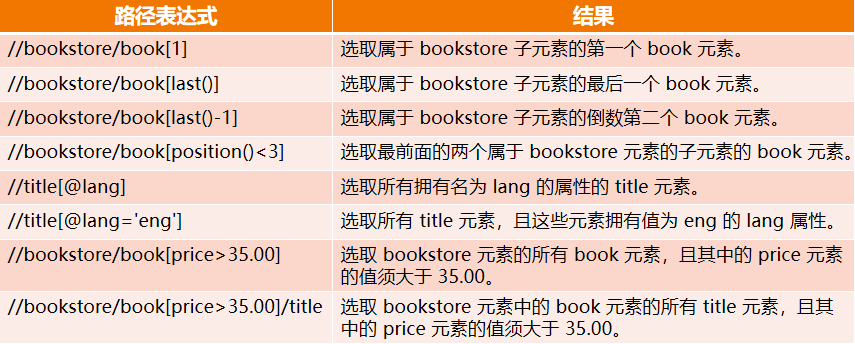 谓语被嵌在方括号中。在下面的表格中,我们列出了带有谓语的一些路径表达式,以及表达式的结果。实例: