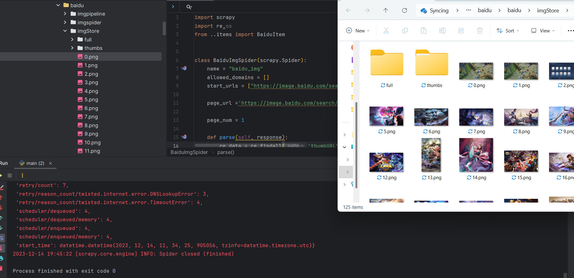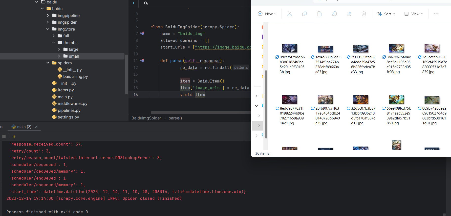 get_img来处理这些请求。 get_img方法处理图片下载的响应。创建一个BaiduItem实例,并将下载的图片数据(二进制格式)存储在img_data字段中。- 将包含图片数据的item提交给Pipeline进行进一步处理。