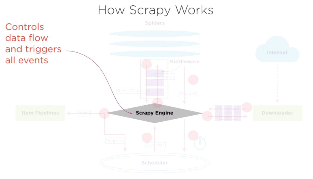- 引擎(Engine): Scrapy引擎是框架的核心,负责控制数据流在各组件之间的流动,触发事件。