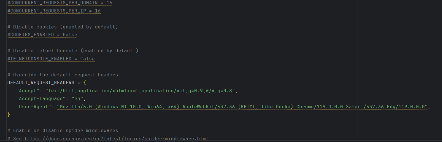settings.py文件中,可以配置各种参数,比如ROBOTSTXT_OBEY(是否遵守网站的robots.txt规则)和DEFAULT_REQUEST_HEADERS(默认的HTTP头部)。