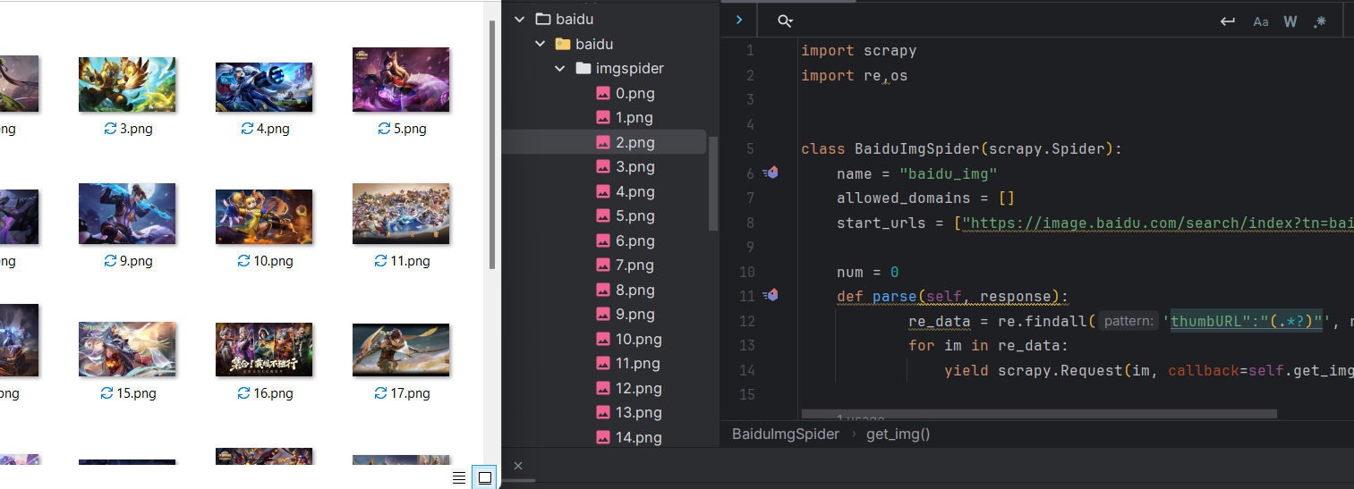 BaiduImgSpider的爬虫类。 start_urls包含了开始爬取的URL(百度图片搜索结果)。parse方法处理响应并提取图片URL。- 使用正则表达式从页面中提取图片的URL。