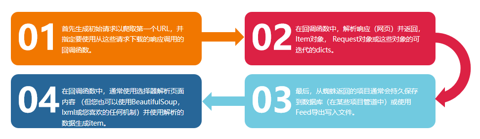 - 蜘蛛(Spiders): 是用户编写用来解析响应并从中提取数据(提取的项目)或额外的跟进URL的类。