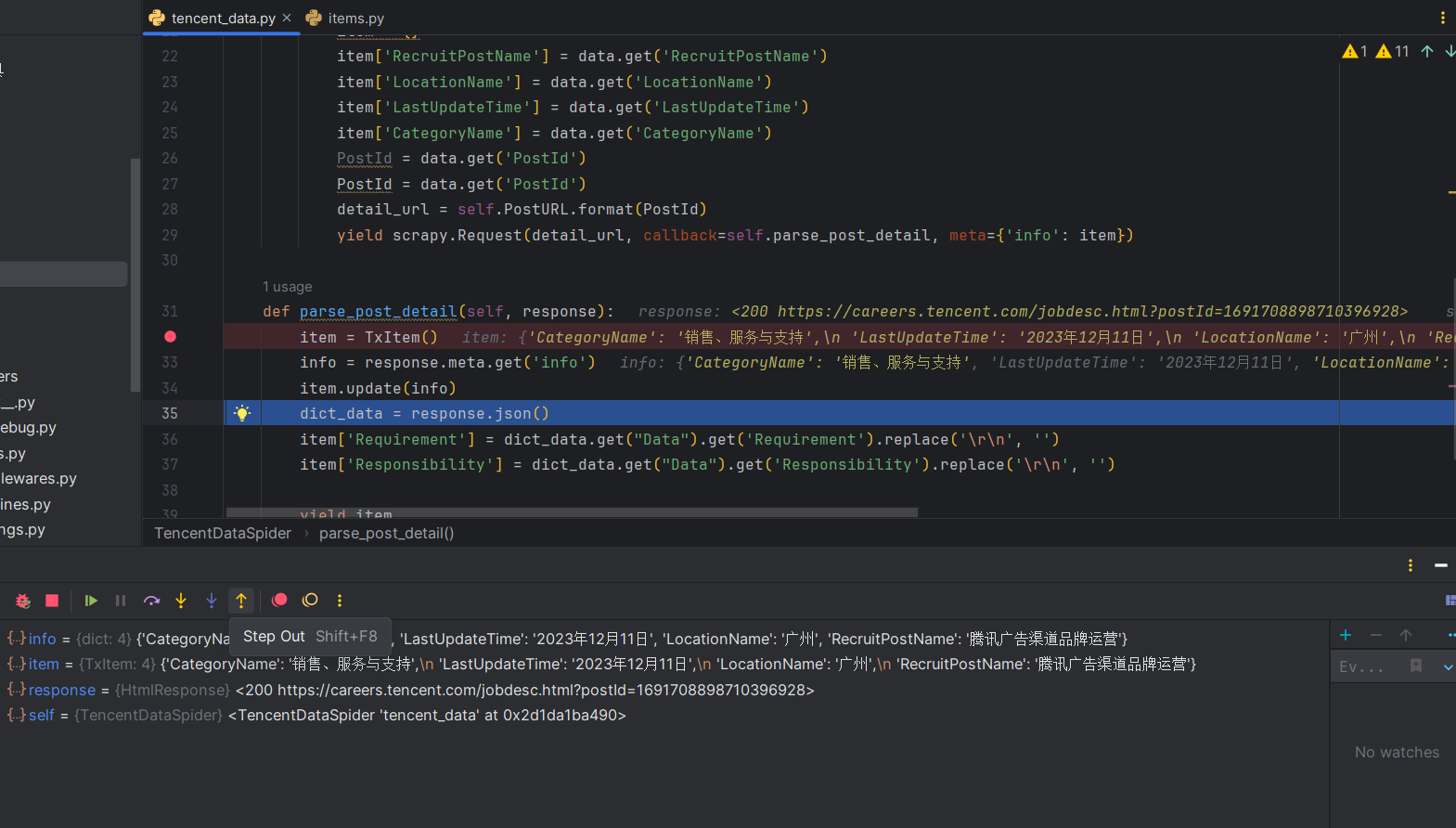 scrapy crawl <spider_name>来运行爬虫。这里<spider_name>是在创建爬虫时指定的名称。 - 例如: