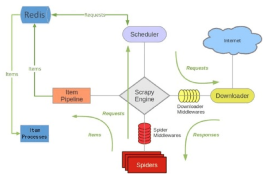 - 分布式数据处理: 爬取到的数据(Items)被推送至Redis中,允许部署多个数据处理节点。
