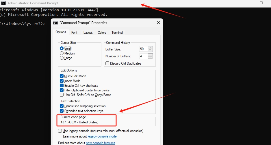 - 首先,管理员身份打开命令提示符窗口。在窗口顶部右击选择属性,选中选项后会看到默认编码为GBK。(OEM一样乱码)
