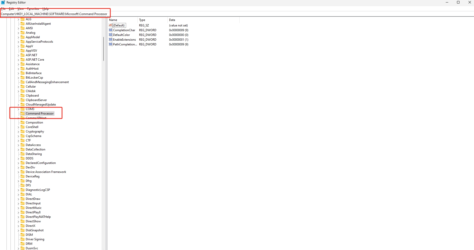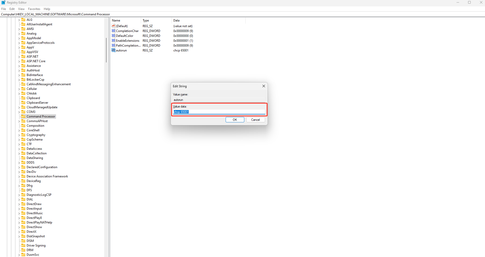 regedit,点击确定按钮,打开注册表窗口,按照图中的路径打开command processor项